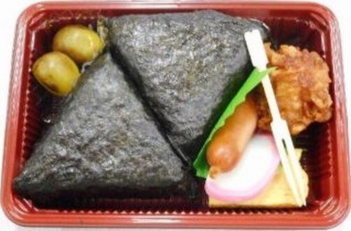 おにぎり弁当:おにぎり、漬物、玉子焼き、ウインナー、唐揚げ、蒲鉾